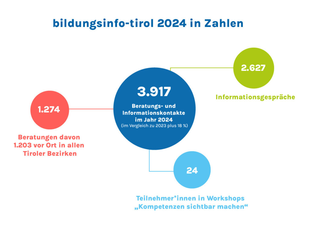 Die bildungsinfo-tirol ist die Anlaufstelle für Fragen rund um Bildung und Beruf und schafft Klarheit bei Bildungs- und Berufsthemen. Wir bieten an neun Standorten in allen Tiroler Bezirken sowie online Informations- und Beratungsangebote an. Berufswege sind immer mehr geprägt von Phasen der Neuorientierung, der Veränderung oder der Weiterbildung. Hier setzt die bildungsinfo-tirol mit der anbieterneutralen Beratung an und bietet Unterstützung beim Planen, Treffen und Umsetzen von Bildungs- und Berufsentscheidungen. Zudem werden laufend aktuelle Themen rund um den gesellschaftlichen, ökologischen und digitalen Wandel im Zusammenhang mit der Bildungs- und Berufsberatung in unsere Arbeitspakete integriert.